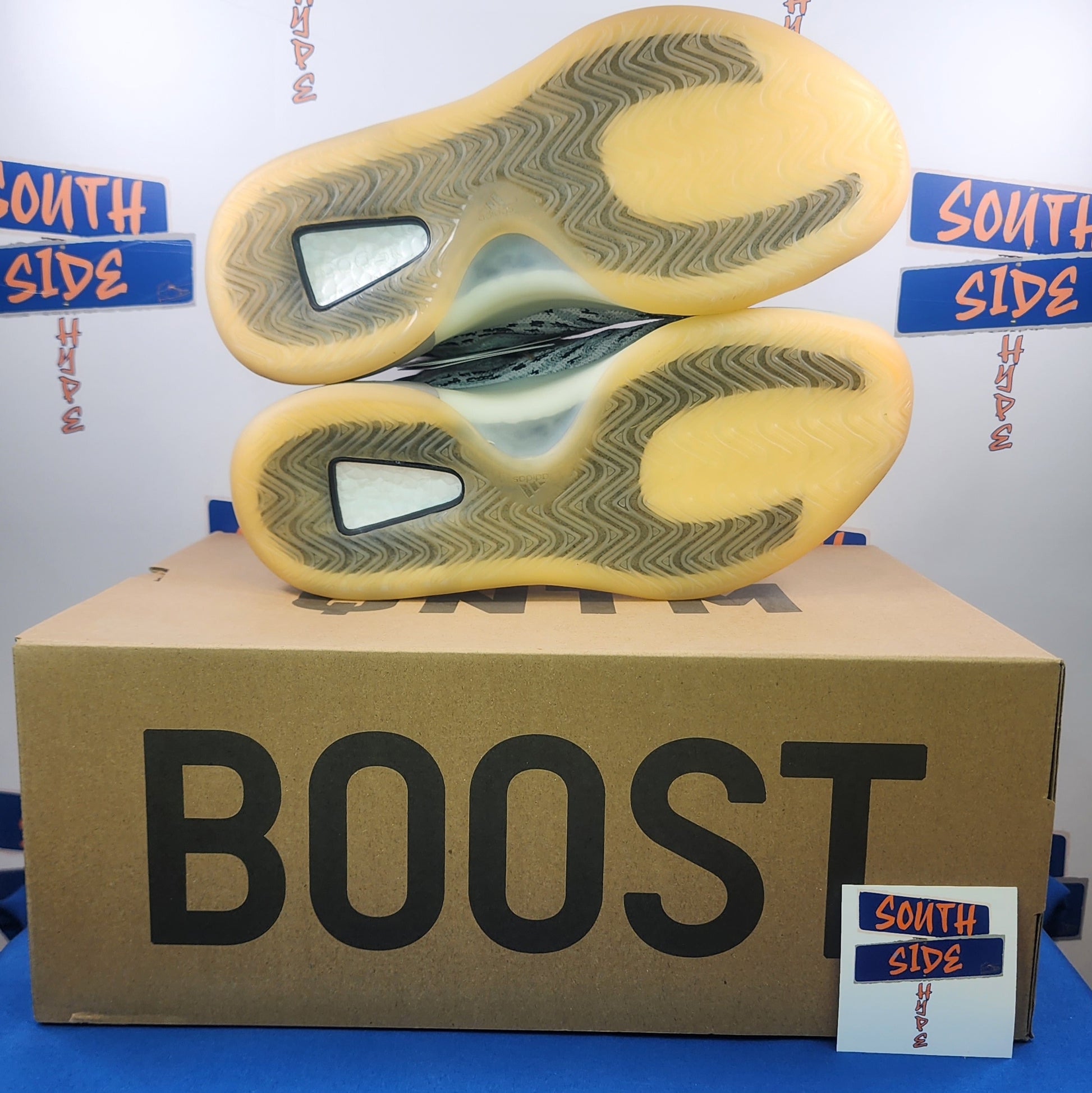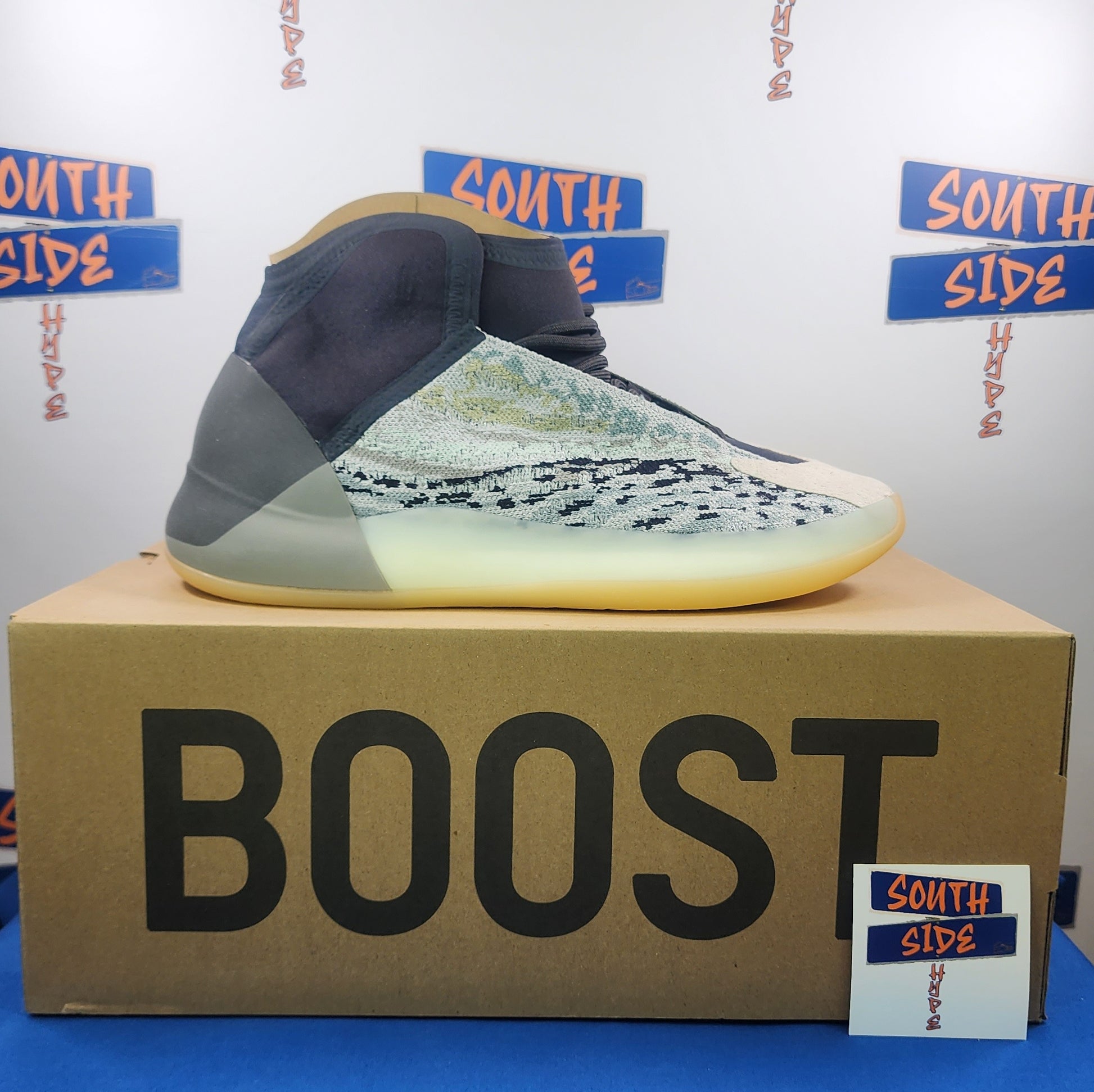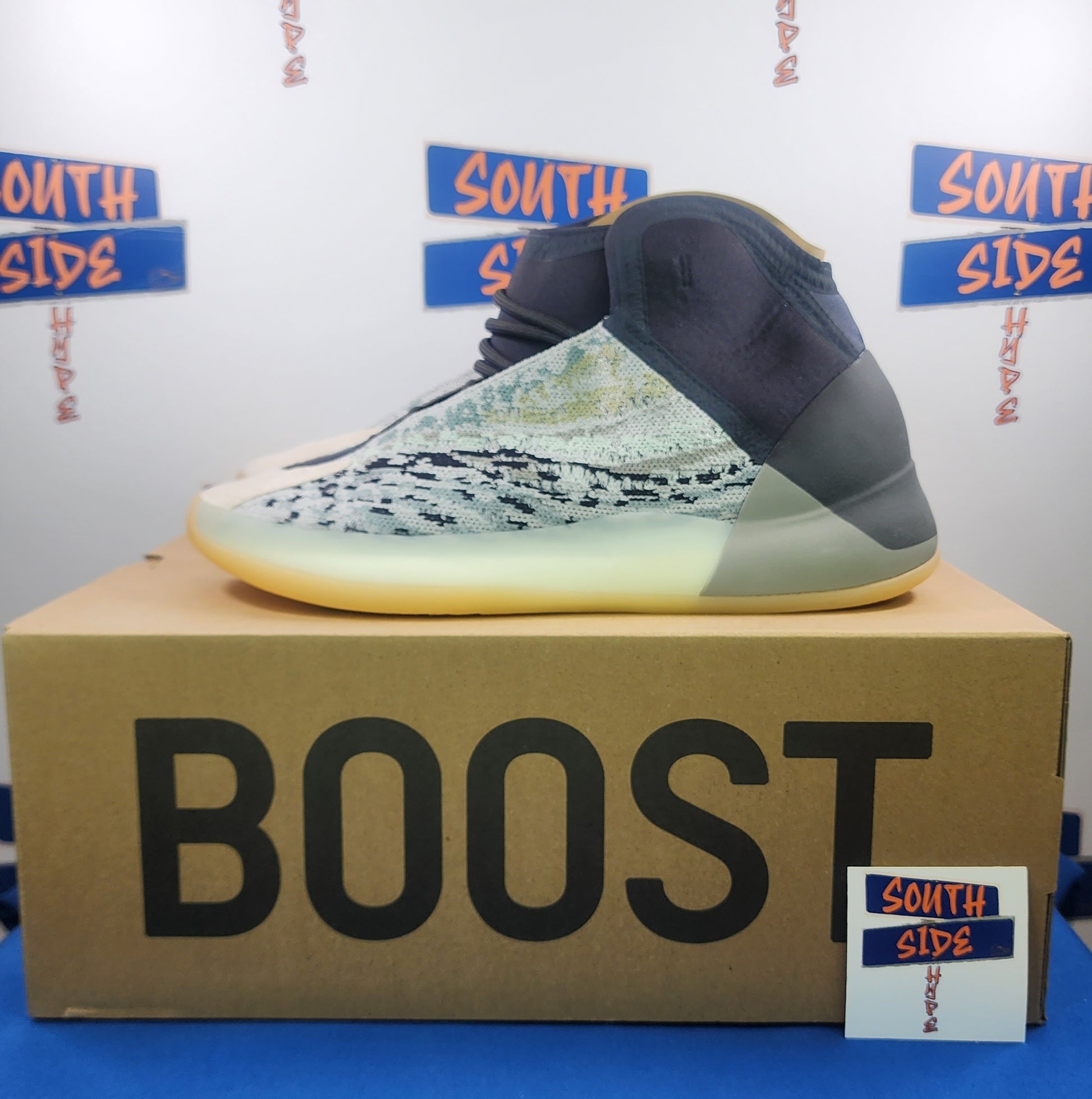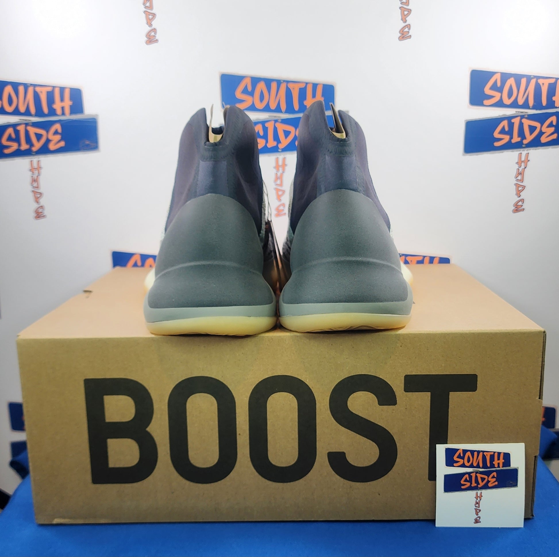 The shoe's upper is made of PrimeKnit material, showcasing a teal color scheme with subtle black accents. The tongue contrasts in black, extending to the ankle and heel, creating a distinctive half-and-half design. Like other QNTM models, the Sea Teal version incorporates adidas' Boost cushioning technology in the midsole for responsive and comfortable cushioning.